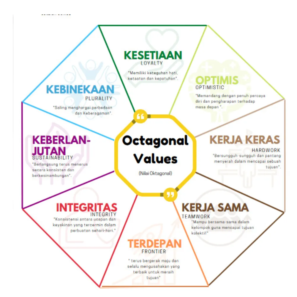 ✓ Individu memiliki nilai-nilai Indonesia Jaya Integritas, sikap loyal, menghargai, kebhinekaan, sikap kerjasama, sikap optimisme, sikap kerja keras, terdepan dan menerapkan prinsip-prinsip keberlanjutan.